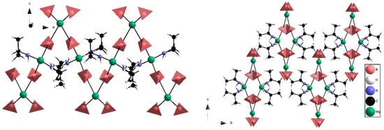 Experimental structure of Mg(BH4)2∙(CH3)2CHNH2 viewed in the a-c plane (left) and b-c plane (right). In the a-c plane the chain-like structure with alternating Mg2+ environments is visible. The b-c plane shows how the chains arrange to form flat polar helixes, which are surrounded by apolar regions. Atoms: magnesium (green), carbon (black), nitrogen (blue), BH4− (red tetrahedron) and hydrogen (white).