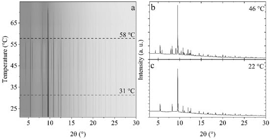 In situ synchrotron radiation powder X-ray diffraction (SR-PXD) data were acquired at the I11 beamline at the Diamond light source, Oxford, UK (λ = 0.826366 Å) []. The samples were measured in the temperature range from 20 to 75 °C at a heating rate of 2 °C per min.