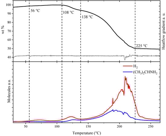 Thermogravimetric analysis (TGA) and differential scanning calorimetry (DSC) were measured using a PerkinElmer STA 6000 coupled with a mass spectrometer (MS) (Hiden Analytical HPR-20 QMS sampling system). Approximately 2 mg was placed in a closed Al2O3 crucible and was heated from 30 to 300 °C (ΔT/Δt = 2 °C/min) with an argon purge rate of 30 mL/min. The lid had a small hole for outlet gas, which was examined using mass spectrometry for hydrogen (m/z = 2) and isopropylamine (m/z = 44).