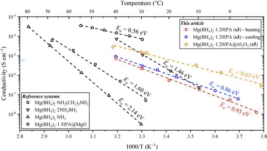 The “paste-like” nature of sample s5 was maintained even after storage at −18 °C for 24 h, indicating that recrystallization was inhibited by the presence of nanoparticles. The thermal stability of Mg(BH4)2∙1.20(CH3)2CHNH2 (s3) was limited by the presence of ~20% Mg(BH4)2∙2(CH3)2CHNH2, which represents eutectic melting with a fraction of the sample at T = 56 °C. Thus, this sample (s3) has low thermal stability as compared to other similar compounds, i.e., Mg(BH4)2∙2NH3BH3 (47 °C) [], Mg(BH4)2∙NH2(CH2)2NH2 (75 °C) [] and Mg(BH4)2∙NH3 (90 °C) []. However, the activation energy for Mg2+ cationic conductivity is significantly lower for Mg(BH4)2∙(CH3)2CHNH2 (s3), EA = 0.86 eV, as compared to similar compounds presented in Figure 6 This advantage is even more pronounced for the nanocomposite Mg(BH4)2∙(CH3)2CHNH2−Al2O3 (s5), with an activation energy of 0.65 eV. Thus, the advantage of this new material is a moderate temperature dependence of the cationic conductivity, which has an exceptionally high value at low temperatures. Furthermore, the soft nature of the sample may improve contact with the electrodes, which is a major challenge in these all-solid-state systems.