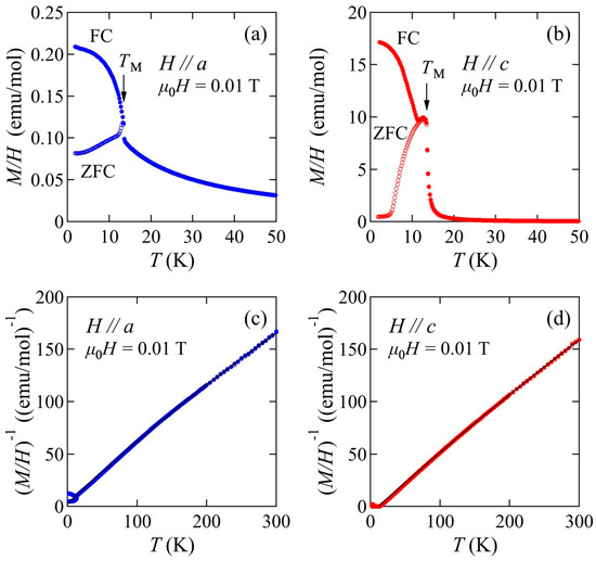 The temperature dependences of the magnetic susceptibility (M/H) were measured in a field of 0.01 T. The results along the a and c axes are presented in Figure 4a,b, respectively. A clear magnetic transition (TM) appears at 13.5 K in both field directions. The transition temperature of our floating-zone crystal exceeded that of the flux-grown crystals [23]. Here, TM defines the temperature at which clear hysteresis occurs between the ZFC and FC processes. Such hysteresis can be attributed to pinning of the magnetic domains below the magnetic ordering temperature. We also observe a large anisotropy of the magnetic susceptibility below TM between H//a and H//c, as seen in the flux-grown crystal [23]. Figure 4c,d plot the temperature dependence of the inverse magnetic susceptibility (M/H)−1 along the a and c axes, respectively. The black lines in the figures are the fits to the Curie–Weiss law, , where kB, NA, μB are the Boltzmann constant, Avogadro’s number, and the Bohr magneton, respectively. From the fits between 100 and 300 K, the effective magnetic moments (μeff) in the paramagnetic region were μeff = 3.57 μB and 3.66 μB under H//a and H//c, respectively. These values are very close to the theoretical value of the free Nd3+ with a total angular momentum of J = 9/2, which corresponds to μeff = 3.62 μB. The results suggest a well-localized nature of the 4f electrons. The small temperature-independent term χ0, which typically represents Pauli paramagnetic and Larmor diamagnetic contributions, was 8.14 × 10−4 (4.82 × 10−4) emu/mol for H//a (H//c). The Weiss temperatures under H//a and H//c were obtained as θP = −4.4 K and +11.4 K, respectively. Here, the negative and positive θP indicate an antiferromagnetic correlation and ferromagnetic coupling, respectively.