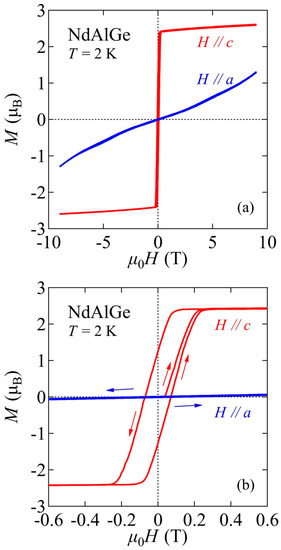 The anisotropy of the magnetic property was observed by the isothermal magnetization at 2 K under H//a and H//c up to 9 T (Figure 5a). Figure 5b enlarges the low-field region to emphasize the obvious hysteresis under H//c. The overall behavior is similar to that observed in flux-grown crystals, in which measurements were performed up to 30 T [23]. The magnetization under H//c shows a clear hysteresis with a remnant magnetization and a small coercive field of 0.07 T, indicating magnetic order with a spontaneous magnetization. In contrast, the a-axis magnetization shows no clear hysteresis and is nearly 100 times smaller than the c-axis magnetization at 0.3 T. The a-axis magnetization is linear in H up to 2 T and slightly deviates upwards at higher field. The strong anisotropy suggests that NdAlGe has an Ising-like magnetism with the c axis being the easy axis.