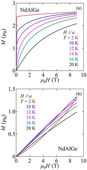 Figure 6a,b plot the isothermal magnetization of NdAlGe under H//a, and H//c, respectively, at several temperatures across the TM. These data were taken after field cooling. Under H//c, the rapid increase in magnetization at low fields was suppressed as the temperature increased. The remnant magnetization disappeared at TM. Under H//a, the upward behavior observed at 2 K was suppressed as the temperature was raised.