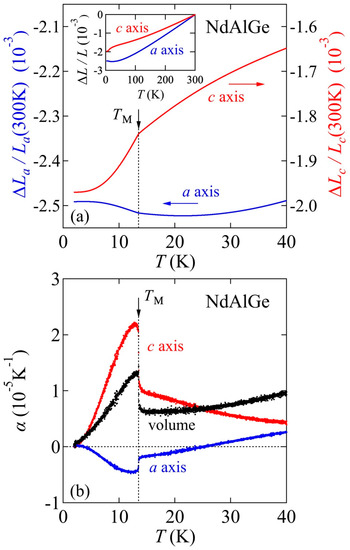 Thermodynamic phase transitions can be detected through thermal expansion experiments, which provide the directional information along the independent crystallographic axes [47]. In contrast, specific heat measurements probe the overall information on phase transitions, as shown in Figure 7. Figure 8a shows the linear thermal expansions , where the index i refers to the a and c axes, as functions of temperature. The inset shows the temperature-dependent up to 300 K. Both and show a clear kink (not a discontinuous jump) at TM = 13.5 K, suggesting a second-ordered phase transition. Moreover, the results are highly anisotropic: on cooling, the thermal expansions along the a and c axes increase and decrease below TM, respectively. This result is possibly attributable to the anisotropic magnetic correlations of this material, as discussed for NdAlSi [14]. Figure 8b presents the temperature dependence of the linear thermal expansion coefficient along the a and c axes. Also shown is the volume expansion coefficient αv deduced as 2αa + αc, considering the tetragonal crystal symmetry of this material. Anomalies in both αa and αc correspond to the magnetic transition temperature at TM, suggesting a strong magnetoelastic coupling in NdAlGe.