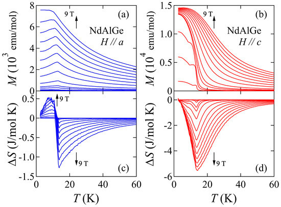 The magnetocaloric effect, which determines the correlation between the ordered magnetism and entropy, is worth exploring in magnetic materials. The magnetocaloric effect is a consequence of temperature change (heating or cooling) in a magnetic material under adiabatic conditions when an external magnetic field is applied and removed [48]. The efficiency of the magnetocaloric effect can be evaluated through the magnetic entropy change ΔSM, defined as the entropy difference between the magnetized material (S(H)) and demagnetized material (S(0). Formally, ΔSM = S(H)–S(0) [45]. The magnetocaloric effect is usually examined in ferromagnetic materials because such materials should, in principle, gain larger ΔSM through the demagnetized and magnetized process than non-ferromagnetic materials [49,50,51]. Although evaluating the ΔSM of NdAlGe with Ising-like magnetization under H//c (Figure 5a) is an interesting proposition, the ΔSM of Nd-containing materials are rarely considered because the magnetic moments of materials containing light rare-earth elements are smaller than those of other magnetocaloric materials containing heavy rare-earth elements such as Ho, Gd or transition metal Fe [49,50,51].