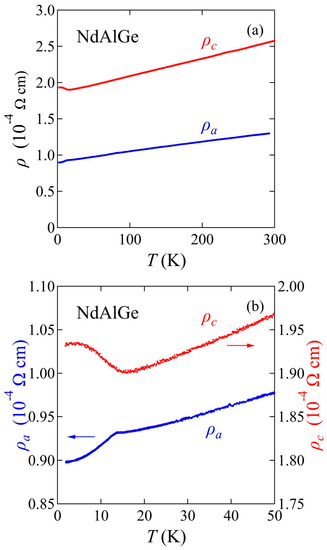 The floating-zone technique obtained the large-sized NdAlGe crystals in which we could investigate the directional electrical charge transport properties. Figure 10a presents the temperature dependences of the electrical resistivities ρa and ρc as the current flow along the a and c axes, respectively. Figure 10b enlarges the low temperature region. Both ρa and ρc exhibit metallic behaviors with sublinear temperature dependence at a high temperature. We also mention that the resistive behavior in ρa was identical along the radial direction in the grown crystal, suggesting there were homogeneous crystals in the ingot. The residual resistivity ratios (RRRs) were approximately 1.5 and 1.4, respectively. Comparable RRRs were reported in floating-zone crystals CeAlGe and PrAlGe, in which the materials were almost stoichiometric [11,17]. We also mention that the RRRs in our crystals were lower than those seen in the flux-grown crystals [14,16,18,21]. The resistive anisotropy of NdAlGe (ρc/ρa~2) was almost temperature-independent in the paramagnetic region (above TM), but the behaviors of ρa and ρc contrasted below TM; specifically, ρa and ρc were suppressed and enhanced below TM, respectively. In typical magnetic materials, in general, spin scattering and/or reconstruction of the Brillouin zone can influence the scattering rate of the conducting carriers when the system enters the ordered state [54,55]. Suppression of the scattering rate by spin scattering is frequently seen in the magnetic materials, for example, in the ferromagnetic oxide SrRuO3 [42]. Meanwhile, Brillouin zone reconstruction may enhance the resistivity, as observed in a pressure-induced antiferromagnetic ordered state in FeSe [56]. In NdAlGe, the upturn seen in ρc is possibly attributable to a reconstructed zone, whereas the downturn in ρa below TM might be dominated by suppression of the spin scattering.