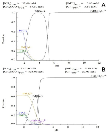 Speciation of palladium ions in the reaction mixture solution of: (A) 0.8 mM Pd(II) ions, 52 mM ammonia, 87.5 mM of acetic acid and 3.5mM chloride anion vs pH; (B) 4.8 mM Pd(II) ions 312 mM ammonia, 525 mM of acetic acid and 20 mM chloride anion modeling the higher concentration in of cross-linking agent in frozen state (Diagram created by Medusa software).
