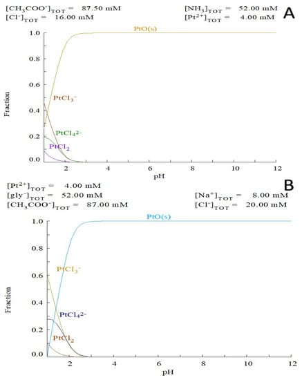 Speciation of Pt ions in reaction mixture: (A) 4 mM Pt(II) ions 52 mM ammonia, 87.5 mM of acetic acid and 16mM chloride anion vs. pH; (B) 4 mM Pt(II) ions 52 mM glycine, 87 mM of acetic acid and 20 mM chloride anion modeling vs pH(Diagram created by Medusa software).