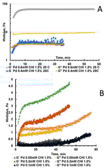 Monitoring the kinetic of formation and stability of gels using oscillatory shear rheology. Storage modulus, G′, and loss modulus, G′′. G′ and G′′ as a function of the shear stress amplitude σ for f = 1 Hz: (A) Kinetics of CHI-[PdCl4] 0.4 mM and 0.6 mM hydrogel formation at pH 5.6 and 20 °C; (B) Kinetics of CHI-[PdCl4] 0.05 mM, 0.1 mM and 0.2 mM hydrogel formation at pH 5.6 and 20 °C.