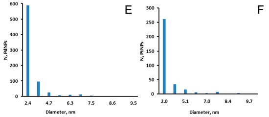 SEM images of CHI-GA-PdNPs cryogels: (A) 0.8 mM and (B) 1.0 mM; TEM images of cryogel walls: (C) CHI-GA-PdNPs 0.8 mM, (D) CHI-GA-PtNPs 4 mM; (E) PdNPs size distribution in CHI-GA-PdNPs 0.8 mM cryogel; (F) PtNPs size distribution in CHI-GA-PtNPs 4 mM cryogel.