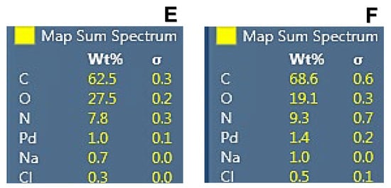 Energy-dispersive X-ray spectroscopy analysis of CHI-GA-PdNPs confirmed the absence of PdNPs aggregates and good distribution of nanoparticles in the bulk of the cryogels walls, which is in good agreement with SEM images at high magnification (Figure 5 and Figure S1). As expected, the chloride ions released during the formation of PdNPs act as counter ions to the protonated amino groups of chitosan. The higher PdNPs content, the higher the concentration of chloride ions was found, due to decomposition of [PdCl4]2− (Figure 5E,F).