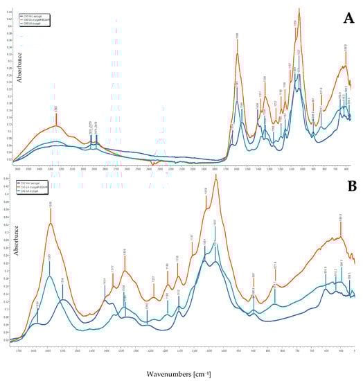 FTIR spectra of freeze dried cryogels CHI-GA-PdNPs 0.2 mM; cryogels CHI-GA and CHI dissolved in acetic acid in the wavenumber range of: (A) 3700–600 cm−1; (B) 1800–600 cm−1.