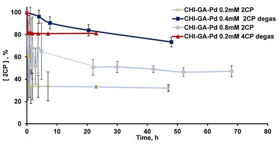 It can be assumed that self-termination after several hours occurred due to the accumulation of carbon monoxide onto PdNPs, or due to the formation of cyclohexanone, which immediately interacts with primary amino groups of CHI and therefore change the microenvironment, blocking the subsequent diffusion of the contaminant to the PdNPs surface. The complete catalytic conversion of the selected chlorophenols was not achieved, which can be due to poisoning on the mechanism similar to previously reported, but the study of the mechanism was beyond the scope of this work and was not further investigated.