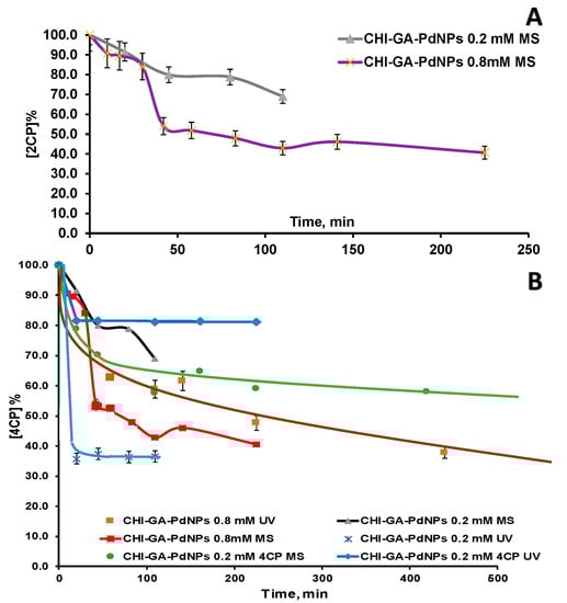 Kinetic curves of chlorophenols (50 ppm) decomposition in a batch mode in presence of CHI-GA-PdNPs 0.2 mM (4.9 μg PdNPs) and 0.8 mM (44.8 µg PdNPs) cryogels and formic acid (20 mM): (A) 2CP was monitored by GC-MS; (B) 4CP was monitored by GC-MS and UV spectroscopy.