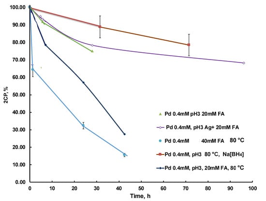 To test the hypothesis of poisoning by released chloride ions, the reaction was carried out in the presence of silver ions, which should lead to the precipitation of silver chloride and eliminating chloride ions from the system. The kinetic rate of the reaction in presence of silver was similar to that of reduction with sodium borohydride (Figure 9). The control experiment of mixing 2CP with silver nitrate did not result in a shift or absorbance intensity of 2CP over a few hours. Thus, this reaction setup did not lead to a significant improvement in the conversion rate and may be costly for real life application (Figure 9 and Figure S12). This may be due to the fact that AgCl crystals were precipitated on PdNPs blocking the active catalytic site. Increasing the reaction temperature to 80 °C led to a significant acceleration, showing that the conversion efficiency of 2,4-dichlorophenol reached 85% and 73% within 42.5 h, respectively (Figure 9 and Figure S13). Nevertheless, after several hours of reaction, the hydrodechlorination reaction self-terminated, resulting in a 40% decrease in the concentration of 2,4-dichlorophenol at pH 3 at ambient temperature. Most likely, this is due to the accumulation of carbon monoxide, which blocks active sites of the catalyst. As recently reported, at 85 °C, a side reaction of the decomposition of formic acid proceeds in the form of the formation of carbon monoxide, which poisons the catalyst [42]. Increasing the pH of reaction mixture to 6.2 did not improve the conversion degree. Increasing the temperature to 80 °C accelerated the 2CP decomposition reaction with an efficiency of 67% in 24 h and 85% for 42.5 h compared to 25% conversion at room temperature (Figure 9). The control experiment for the hydrogenation of 2CP using borohydride confirms that the catalyst is active at standard conditions of the hydrogenation process without significant catalyst poisoning. However, the use of borohydride had some drawbacks, such as the formation of gas bubbles in the cryogel structure, which can change the diffusion of the substrate and affect the kinetics during long-term use. Increasing the formic acid concentration to a ratio of 1:100 to the substrate (40 mM) accelerated the reaction at 80 °C (Figure 9).