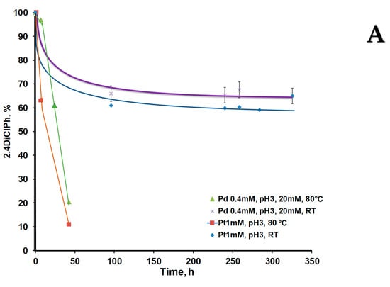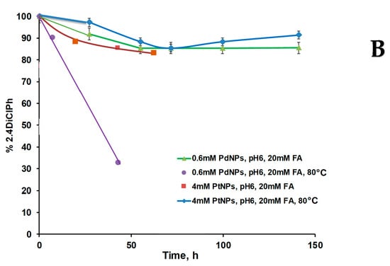 Kinetic curves of 2,4DiClPh de-chlorination process in batch mode in the presence of CHI-GA-PdNPs and CHI-GA-PtNPs cryogels at room temperature or at 80 °C The mixture of 2,4DiClPh (65.2 ppm) and formic acid (20 mM) at: (A) pH 3 and; (B) pH 6.2.