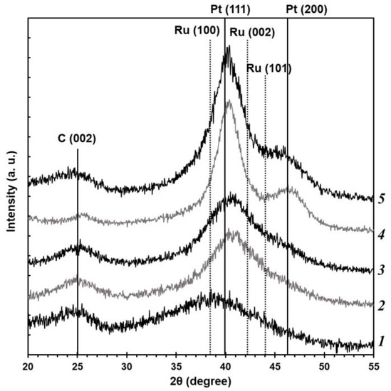 Figure 1), although this does not exclude the presence of the X-ray amorphous phases of ruthenium oxide in the synthesized materials. The commercial PtRu/C-AA catalyst containing the same phases as the obtained materials has been studied for comparison. The reflections of the metal phase for all the studied materials are significantly widened, which testifies to the smaller size of crystallites. The size of metal crystallites (D