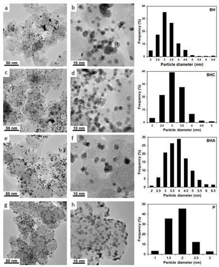 4 demonstrate the larger NPs with the average size of 3.1 to 3.9 nm and the wide size dispersion. Meanwhile, a substantial number of agglomerates are observed in the TEM micrographs. According to the TEM data, the BHA material exhibits the biggest average size of particles (3.9 nm), the widest size dispersion of NPs, and the most pronounced agglomeration on the carbon support surface among the studied samples (