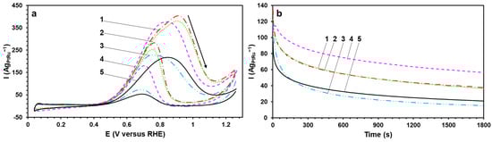 Figure 5b). At the initial time, the studied catalysts are characterized by close values of the current density (I