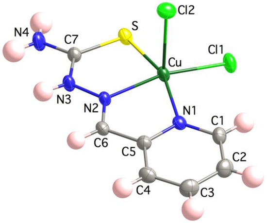 The crystal structure of 3 contains monomeric [Cu(HL)Cl2] entities and one crystallization water molecule per formula (Figure 1). The Cu(II) ion is coordinated to the NNS chelating set of the TSC ligand and two chlorido ligands in an square pyramid fashion, τ5 = (α − β)/60 = 0.06 (ranging from τ5 = 0 square pyramid SPY-5 to τ5 = 1 trigonal bipyramid BPT-5 geometries) [73]. Selected distances and angles are provided in Table 2. A choice of structural parameters (i.e., bonds, angles and non-bonding contacts) allows one to identify the neutral (HL) vs. anionic (L−) character of the TSC ligand [74]. These parameters are C7–S, Cu∙∙∙N3, N2∙∙∙C7, Cu–N2–N3, N2–N3–C7, S–C7–N3 and S–C7–N4 whose values in 3 are 1.7076(1) Å, 2.9068(3) Å, 2.3003(2) Å, 120.13(1)°, 118.20(1)°, 121.03(1)° and 121.78(1)°, respectively, which fall in the range of those expected for Cu(II) compounds containing non-deprotonated neutral TSC ligands. The lattice is stabilized with hydrogen bonds involving the hydrazine N3, thioamide N4, apical chlorido Cl2 and water O atoms (see Supporting Information). π-π Interactions between pyridine and thioamide fragments of neighbor entities are also present and, probably, anion-π interactions with Cl∙∙∙C6i distances of 3.4576(3) Å (i = −x + 1, −y, −z+1). The closest Cu(II) ions are placed at 4.182(6) Å.
