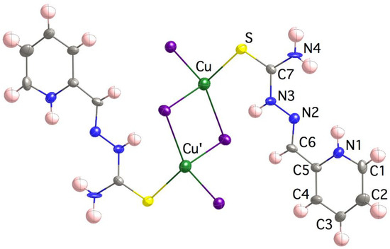 Compound 4 is formed with dinuclear [{Cu(H2L)I2}2] motives (Figure 2), where each of the Cu(I) ions is bonded to a terminal I− ligand, the thioamide S atom and two bridging iodido ligands that generate a [Cu2(μ-I)2] core. Note that the TSC ligand behaves as monodentate, stabilizing soft-to-soft Cu(I)–S bonds, in good agreement with most of the structures reported for TSC-Cu(I) species. The coordination polyhedron is clearly tetrahedral, τ4 = [360 − (α + β)]/141 = 0.88 (τ4 = 0 square planar SP-4 vs. τ4 = 1 tetrahedral T-4 geometries) [76]. It is worth noting that the C7–S bond length is extraordinarily similar to that in the (H2L)Cl∙H2O compound, two molecules in the asymmetric unit with C7–S bond lengths of 1.687(6) and 1.680(6) Å [77,78], and even shorter than that in the free ligand HL∙nH2O structure, 1.698 Å [55,79,80,81]. The intramolecular Cu∙∙∙Cu’ distance is 3.662(3) Å, while the closest intermolecular Cu(I) are 7.570(2) Å away. The shortening of both, Cu–S and C7–S bond lengths in compound 4 with respect to those in compound 3 (see Table 2), despite the former containing larger Cu(I) ions, could be due to the presence of a charge transfer in 4 which is responsible for its reddish color.