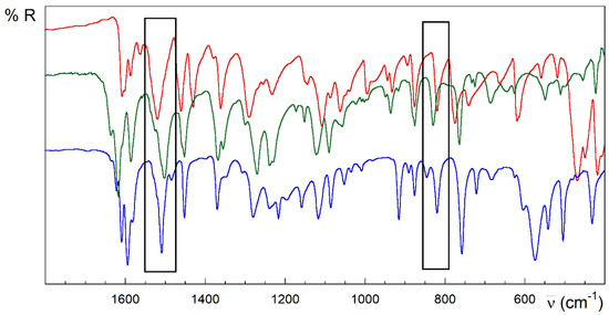 FTIR-ATR spectra of HL (red), (H2L)Cl∙H2O (green) and 4 (blue). Rectangles in black show bands in the same spectral regions for the three compounds.