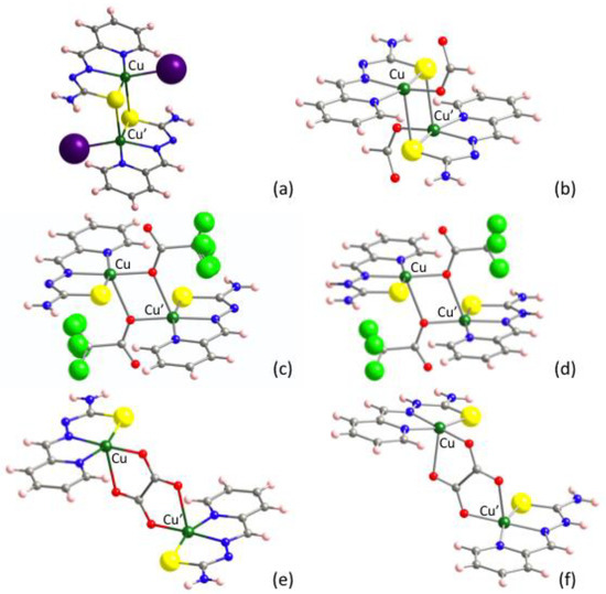 Taking into account that compound 2 exhibits the largest antiferromagnetic interactions in the series given in Table 1, it was our first choice to perform DFT calculations. Surprisingly, the results of the theoretical calculations predicted intradimer ferromagnetic interactions for 2 (Table 5). Two main features differentiate 2 from other compounds where the same methodological approach has yielded excellent results [89]: (i) the presence of heavy iodido ligands linked to Cu(II) ions and (ii) the connectivity of the [CuLI] monomers through S-bridging centers to form S-bridged dimers containing [Cu2(μ-SL)2] cores (Figure 6a). Aiming to check the influence of the iodido coligands, the [{CuL(HCOO)}2] compound was assayed, reviewing an S-bridged centrosymmetric dimer with the same TSC and formato HCOO− coligands bonded to the Cu(II) ions through light O atoms (Figure 6b). Again, a ferromagnetic result was obtained, opposite to the antiferromagnetic experimental behavior.