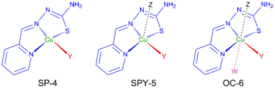 Thiosemicarbazones (TSCs) are organic molecules with azomethine (1), hydrazine (2) and thioamide (3) functional groups (see Scheme 1) [2,3,4,5,6,7,8,9,10,11,12,13,14,15,16,17,18,19,20,21,22,23,24,25,26,27]. In the case of HL, R1 = pyridine (py) and R2 = R3 = R4 = H (Scheme 1 and Scheme 2). The deprotonation of HL occurs from the release of H+ ions from the hydrazine N atom and yields the anionic L− form (Scheme 2). This ligand usually exhibits a tridentate NNS behavior (see atoms with asterisk in Scheme 2) to give planar [Cu(HL)]2+ or [CuL]+ entities, depending on the neutral or anionic form of the TSC in the compound [28,29,30,31,32]. The [Cu(HL)]2+/[CuL]+ entities generate a fourth free position available to link ancillary ligands to yield distorted square planar (SP-4) species, which usually incorporate one or two further ligands to generate square pyramidal (SPY-5) or octahedral (OC-6) polyhedra (Scheme 3).