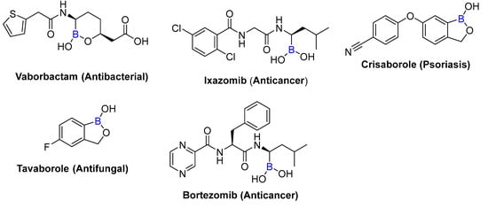 Boron-based hetereocycles are being established as vital templates in the field of medicinal chemistry after the FDA approval of a number of boron-based drugs (e.g., Vaborbactam, Ixazomib, crisaborole, tavaborole and bortezomib) [,], (Figure 2). Literature survey reveals that boron-based heterocycles have tremendous potential in the search for newer pharmacological agents, as they elicit potent activity, can act as biososteres, and they display a wide array of pharmacological activities and appreciable pharmacokinetic profiles [,]. Additionally, more and more organo-boron compounds are inflowing toward clinical trials and the drug discovery pipeline, which suggests that they are proving to be extremely promising therapeutics. Undeniably, they could be effectively amalgamated with other promising medicinal moieties, which might result in potent molecular hybrids demonstrating novel bioactivities and possibly fewer side effects.
