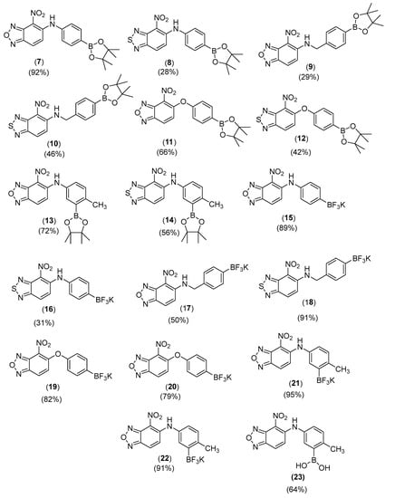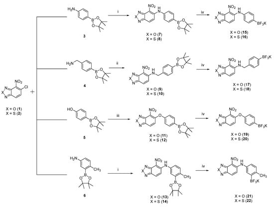 The synthesis of boron-based benzo[c][1,2,5]oxadiazoles and benzo[c][1,2,5]thiadiazoles is depicted in Scheme 1. Initially, we prepared substituted amine linked and ether linked boronic acid pinacol ester derivatives (7–14) by base catalyzed substitution reaction. Further, the synthesized boronic acid pinacol esters (7–14) were converted to corresponding aryltrifluoroborate salts (15–22) in good to excellent yields.