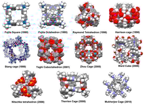 Representative examples of metal organic polygons and polyhedra (MOPs) that appeared in literature since early 1990s until recently, prepared using metal coordination chemistry from various donor-based ligands. In the parenthesis is reported the time when they appeared in literature. Pictures are reproduced by permissions from Refs. [22,27,37,58,59,60,61,62,63,64,65]. Copyright 1990, 1998, 2001, 2005, 2008, 2018 from American Chemical Society. Copyright 1995, 1999 from Nature Publishing Group. Copyright 1998, 2008 from Wiley-VCH.
