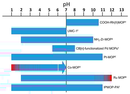 Chemical stabilities of some representative MOPs over the pH range based on literature data. Bar length indicates the pH range that the MOPs remain stable. Arrow represents that the MOP can withstand beyond the pH limit. The red bar indicates the pH ranges that MOPs start to disintegrate. Stabilities are determined by several methods like NMR (†), ESI (‡), powder X-ray diffraction (‖) and fluorescence microscopy ($), apart from those marked with £ representing the methods to determine stabilities are not reported.