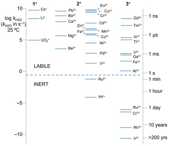 Water exchange rate constants (logkH2O, s−1) and mean lifetime (τH2O, s) for primary shell water molecules on aqua metal ions at 25 °C. The dotted line represents Taube’s inert/labile boundary [70]. Reproduced with permission from Ref. [71]. Copyright 2005 from American Chemical Society.