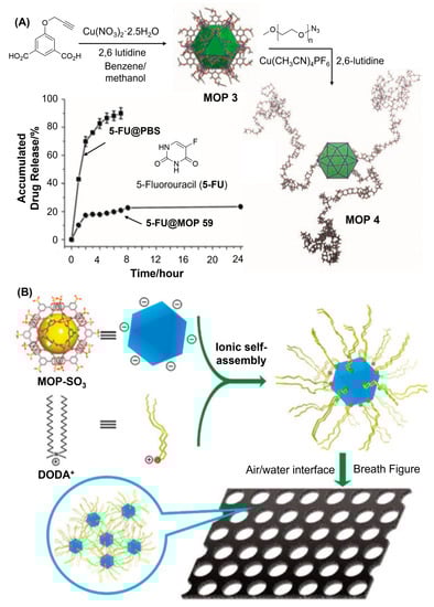 (A) Synthesis of copper (II) containing cuboctahedron MOP 3 and its post-synthetic modification with PEG to give water-soluble and stable MOP 4, and its role in controlled release of 5-fluorouracil (5-FU) drug. (B) Illustration of surface functionalized MOP-SO3 via ionic self-assembly (ISA) and their ordered honeycomb architectures at the air/water interface. Reprinted by permission from Refs. [74,99]. Copyright 2011 from Wiley-VCH and copyright 2012 from Royal Society of Chemistry.