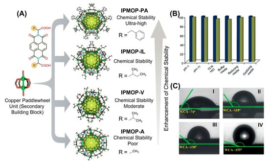 A more generalized way to prepare stable MOPs is to shield the labile metal centers from water/chemical-attack. Anchoring hydrophobic functional groups on the outer surface of MOPs would turn the MOPs more water-resistant [101] and thus should be considered as more generalized and straightforward approach to prepare stable MOPs irrespective of the metal ions and linkers used during the synthesis. Yaghi and coworkers had synthesized dicopper paddlewheel-based carboxylate MOPs functionalized with dodecoxyalkyl chains [85]. Kim and coworkers demonstrated the ability of dodecoxyalkyl-functionalized MOPs to act as synthetic ion channel for transporting proton and alkali-metal ions across lipid membranes [102]. The prospect of potential applications of highly stabilized MOPs makes them more appealing for studying their systematic preparation procedures. In a recent report, Ghosh and coworkers had studied the inertness of copper-based MOPs toward water by systematically putting hydrophobic moieties around the metal centers [75] and had synthesized series of chemically ultrastable copper-based carboxylate MOPs (Figure 7). Four neutral spherical MOPs with general formula [Cu12(Lx)12(H2O)12] (Lx: NDI core-based amino acid variant) were synthesized on a large scale by solvothermal method from dicopper paddlewheel cluster and naphthalene diimide linkers appended with amino acid variants—alanine, valine, isoleucine and phenyl alanine. Eight triangular windows and 24-alkyl groups are appended to each cage structures. Chemical stabilities of those MOPs were investigated under both acidic and basic conditions as well as under several oxidizing and reducing conditions. Smaller alkyl chains on the outer surface render MOPs unstable in water when compared with bulkier alkyl groups-functionalized MOPs. MOPs substituted with isoleucine and valine variants show moderate aqueous stability in comparison with phenyl alanine modified MOP which exhibits ultrastability under a wide range of pH values, in strong oxidizing and reducing media over a period of several days. Such exceptional stability can be attributed to the dense hydrophobic shielding of dicopper paddlewheel metal clusters preventing water molecules and other chemicals to undergo chemical ligation at the labile metal centers. Contact angle measurement revealed that hydrophobic (WCA ≈ 74°) to superhydrophobic surface (WCA ≈ 155°) properties can be achieved for copper-based carboxylate MOPs by simply fine-tuning the alkyl-side chains on the outer surface of MOPs.
