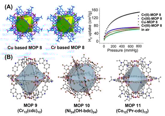 (A) Crystal structures of CuII-based MOP 8 and CrII-based MOP 8. H2 adsorption isotherms of Cr(II)-MOP 8, Cr(III)-MOP 8, Cu(II)-MOP 8 and Cr(III)-MOP 8 kept in air for 1 month. (B) Crystal structures of MOP 9 (Cr12(cdc)12), MOP 10 (Ni24(OH-bdc)24) and MOP 11 (Co12(iPr-cdc)12) are shown. Reprinted by permission from Refs. [104,107,111]. Copyright 2017, 2018 from American Chemical Society.