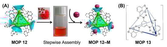 (A) Assembly of the tetrahedron MOP 12 with calixarene-like coordination-active vertices for potential metal ion trapping. (B) Titanium-based tetrahedron metal cluster MOP 13. Reprinted by permission from Refs. [59,112]. Copyright 1998 from Wiley-VCH and copyright 2017 from American Chemical Society.
