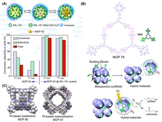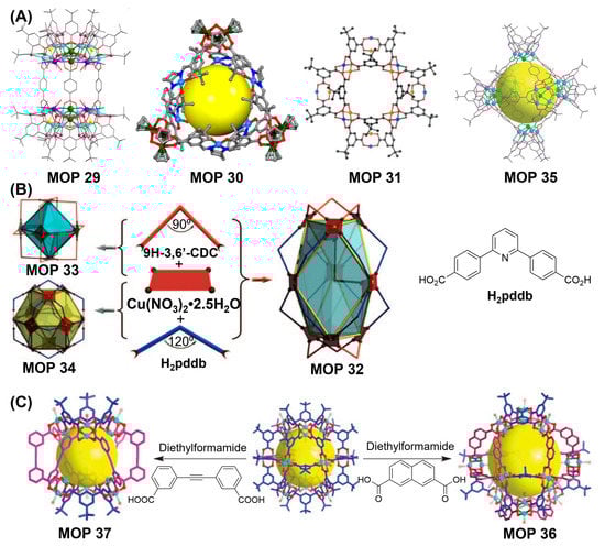 (A) Crystal structures of metal organic polyhedra—MOP 29, MOP 30, MOP 31, MOP 35 prepared using mixed-metal and mixed-ligand strategies. (B) The self-assembly of three metal-organic polyhedra MOP 32, MOP 33 and MOP 34 with ditopic angular linkers and four-connected square nodes are reported. (C) Mixed ligand MOP 36 and MOP 37 were prepared via ligand-exchange strategy. Reprinted by permission from Refs. [89,138,140,141,142,143]. Copyright 2009 from Wiley-VCH. Copyright 2012 and 2016 from Royal Society of Chemistry. Copyright 2015 and 2018 from American Chemical Society. Copyright 2010 from Nature Publishing Group.