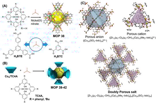 (A) Design principle for the assembly of virus-like metal-organic supercontainers via binding of tetranuclear p-tert-butylsulfonylcalix-[4]arene complex with H3BTE and H3BTC. (B) The nanocoordination octahedra formed by Co4/TC4A shuttlecock-like SBUs and tritopic linkers, where TC4A may be p-tert-butylthiacalix[4]arene/p-phenylthiacalix[4]arene. Copyright 2009 Wiley-VCH Verlag GmbH & Co. KGaA, Weinheim for ([Co4(TC4A)Cl]6(BTC/BTB)8)6−. (C) Charged MOPs used for the preparation of a doubly porous salt where the charge-balancing cations for the cuboctahedron MOP [Cu24(SO3-bdc)24]24− and anions for the tetrahedron MOP [Zr12(μ3-O)4(μ2-OH)12(Cp)12(Me2-bdc)6]4+. A portion of the crystal structure of the doubly porous salt [Zr12(μ3-O)4(μ2-OH)12(Cp)12(Me2-bdc)6]2[Cu24(SO3-bdc)24]. Reprinted by permission from Refs. [139,145,146,147]. Copyright 2012 and 2020 from American Chemical Society. Copyright 2012 from Royal Society of Chemistry. Copyright 2012 from Wiley-VCH.