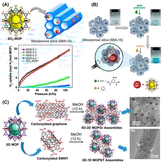 (A) Illustration of dispersion of sulfonated MOP in silica nanopores. H2 adsorption capacities of M3S and SO3-MOP samples at 77 K are shown. The adsorption capacities of M3S samples (mol of H2/mol of MOP) were calculated by subtracting the uptake of the SBA-15 support from the measured uptake. (B) Schematic representation of the synthesis of MOP-SO3H in mesoporous silica cavities (SBA-16) by using a double-solvent strategy. Dispersion of SBA-16 in hydrophobic n-hexane. Addition of a hydrophilic solution of MOP precursors in methanol (metal ions and ligands) followed by addition of the inducer (base) for MOPs formation. (C) Schematic representation of the synthesis of MOPGr and MOPNT assemblies. Reprinted by permission from Refs. [77,149,150]. Copyright 2012 and 2016 from American Chemical Society. Copyright 2017 from Royal Society of Chemistry.