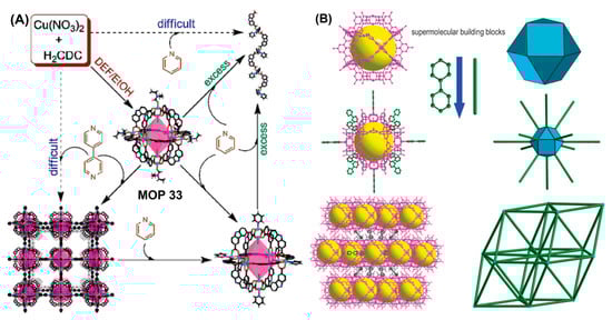 Discrete metal-carboxylate polyhedra are used as building blocks to design porous coordination frameworks, which can also be employed to stabilize metal organic polyhedra that are otherwise unstable hydrolytically or chemically, and often undergo spontaneous aggregation in the solid state after guest removal. Higher thermodynamic stabilities of molecular architectures can therefore be envisaged compared with naked metal ions owing to the prevention of potential attack by solvent molecules or other competing ligands to the metal ions by virtue of strong metal-coordination bond. MOPs interconnected by strong coordination bonds using interconnecting ligands render hydrolytically and chemically stabile MOPs, and subsequently prevented MOP reorganization/aggregation upon guest removal. Therefore, MOPs serving as monomers would definitely facilitate to optimize the shapes, sizes and porosities of the 3D networks by introducing strategic tactics to add new linkers to the MOP solutions. Major challenge to prepare MOP-based extended three-dimensional network is the selection of appropriate MOPs with enhanced solubilities, better stabilities and their abilities to grow into three dimensional networks [152]. Traditional approach is the linking of MOPs by using ditopic and tritopic linkers by replacing axially positioned multiple replaceable solvent molecules attached onto the outer surface of PW metal ions of each MOP. Zhou and coworkers had demonstrated the interconversion between twofold interpenetrated 3D framework (MOF) and molecular octahedron MOP 33 prepared from dicopper-paddlewheel cluster and 9H-carbazole-3,6-dicarboxylate (CDC) with amide (N-H) functional groups (Figure 17A). Amide groups tethered onto each linker form H-bonds with appropriate solvent molecules and therefore improve the solubility of molecular cage [92]. Jahn-Teller distorted axially positioned labile coordinated solvent molecules of octahedron MOP undergo ligand exchange reaction with pyridine or 4,4′-bipyridine molecules leading to the conversion into an extended interpenetrated network ([Cu4(9H-3,6-CDC)4(4,4′-bpy)(H2O)2]3)n with six vertices of each octahedron interlinked with bipyridine ligands and about 76% of solvent accessible area. MOF can be transformed reversibly back into molecular octahedron MOP by dissolving in DEF/py (4:1 v/v; py = pyridine) solvent mixture. Furthermore, excess of pyridine rearranges molecular octahedron to a helical 1D chain which is otherwise difficult to achieve. Su and coworkers had demonstrated the synthesis of porous coordination framework prepared from cubohemioctahedron cage [Cu2(5-NH2-mBDC)2]12•(H2O)24 as precursor which was derived from dicopper paddlewheel SBUs and 5-NH2-mBDC ligands [153]. Solvothermal reaction between cubohemioctahedron cage and 4,4′-bipyridine in N,N′-dimethylacetamide/ethanol (5:1) solvent mixtures afforded 3D framework of molecular formula {{Cu24(5-NH2-mBDC)24(bpy)6(H2O)12]•72DMA} containing both micropore and mesopore cavities (Figure 17B). Intrinsic and extrinsic porosities of MOFs allow the encapsulation (23.76 wt% loading) and release of guest like 5-fluorouracil drug. Approximately 80% of the loaded drug was released within few hours followed by a plateau which is presumably due to the initial MOF-structure degradation as confirmed by PXRD pattern. Majority of drugs are loaded inside the mesoporous cavity of MOFs and the rest are encapsulated within the intrinsic pores of MOPs. Su and coworkers had reported the stepwise synthetic strategy for the construction of three 12-connected MOFs with fcu topologies which are the rare examples of MOFs derived from cubohemioctahedron MOP precursor [Cu24(5-hip)24] (5-hip = 5-hydroxyisophthalic acid) [154]. Three different organic linkers pyrazine, 4,4′-bipyridine and 1,2-di(pyridine-4-yl)ethene afforded three different MOFs with molecular formulas {[Cu24(5-hip)24(pz)6(H2O)12]•64DMF}, {[Cu24(5-hip)24(bpy)6(H2O)12]•119DMF}, and {[Cu24(5-hip)24(bpe)6(H2O)12]•138DMF}). Metal organic framework {[Cu24(5-hip)24(bpe)6(H2O)12]•138DMF}) was successfully utilized to adsorb and separate methylene blue and methyl orange dyes from mixture of solution containing rhodamine B. Interestingly, MOFs constructed from MOP building units exhibited better performance towards adsorption of dyes compared with pristine MOP precursors. Klosterman and coworkers had reported the synthesis of 1D coordination polymers at room temperature from copper-based M4L4 lantern-type MOP which contains inward-directed free amine functional groups and 4,4′-bpy bridging linker. Unsurprisingly the same coordination polymer was not yielded when the M4L4-type MOP precursors are mixed together with 4,4′-bpy bridging ligand in solution [155].