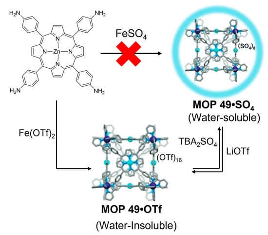 Subcomponent self-assembly of MOP 49•OTf and reversible anion exchange to obtain the water-soluble derivative MOP 49•SO4. Reprinted by permission from Ref. [76]. Copyright 2017 from Wiley-VCH.