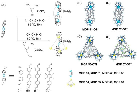 Water-soluble ZnII and CdII-based architectures. (A) Self-assembly of ZnII-helicates and CdII-tetrahedron from C2-symmetric subcomponents I–IV and the tritopic amines TREN and TRPN. Structures based upon bis-(pyridine aldehyde): cationic portions of the X-ray structures of (B) helicate Zn-MOP 51•OTf and (C) tetrahedron Cd-MOP 55•OTf. (D) Cationic parts of the X-ray structures of helicate Zn-MOP 52•OTf (based upon aldehyde (III) and (E) tetrahedron Cd-MOP 57•OTf (based upon aldehyde (IV). Counterions, solvents and disorder are omitted for clarity. ZnII, CdII and fluorine atoms are coloured cyan, yellow, and pale green, respectively. Reprinted by permission from Ref. [174]. Copyright from 2019 from Royal Society of Chemistry.