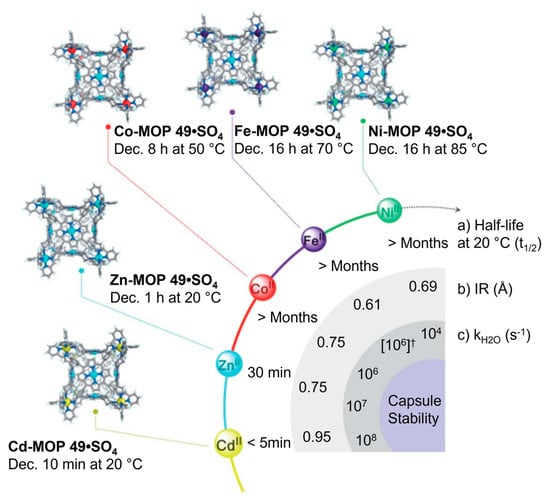 Relative stability of cubes MOP 49•SO4 in water. Crystal structures (Ni-MOP 49, Fe-MOP 49, and Co-MOP 49) and MM3 models (Zn-MOP 49 and Cd-MOP 49) of cubes with their decomposition conditions are presented. (a) Half-lives (t1/2 at 20 °C), (b) ionic radii (IR, Å) and (c) ligand-exchange rates for water (kH2O, s−1) for the different metal ions are displayed for comparison. (†) Although Fe-MOP 49 is low-spin, kH2O for high-spin FeII is given because [Fe(H2O)6]2+ is high-spin. Reprinted by permission from Ref. [174]. Copyright from 2019 from Royal Society of Chemistry.