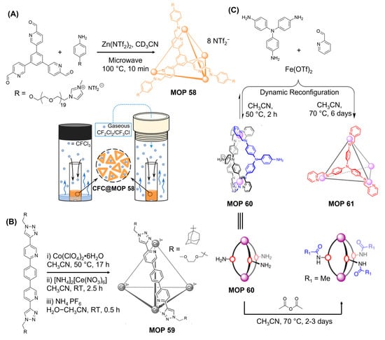 (A) Subcomponent self-assembly of MOP 58 from trisaldehyde, aniline and Zn(NTf2)2 in acetonitrile. When neat liquid MOP 58 was stirred under an atmosphere saturated with CFCl3, CF2Cl2 or CF3Cl, the uptake of these gaseous guest molecules was observed. The samples were subsequently analyzed using solution-phase NMR techniques. (B) Synthesis of non-equilibrium Co(III) capsules following post-assembly oxidation of Co(II) tetrahedron to kinetically inert Co(III) tetrahedron using ceric ammonium nitrate. (C) Subcomponent self-assembly of tris(4-aminophenyl)amine with 2-formylpyridine and iron(II) triflate gave (i) kinetically stable FeII2L3 helicate MOP 60 and (ii) thermodynamic product FeII4L4 tetrahedron MOP 61. Covalent functionalization of helicate MOP 60 gave kinetically trapped helicate MOP. Reprinted by permission from Refs. [178,179,180]. Copyright 2014 from American Chemical Society. Copyright 2015 from Royal Society of Chemistry. Copyright 2020 from Nature Publishing Group.