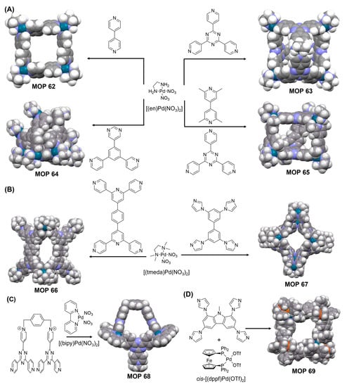 General strategy to prepare palladium-based water soluble cages demonstrated by Fujita and coworkers was further expanded by the same group using cis-capped [(en)Pd(NO3)2] salt. Pyridine/pyrimidine molecular panels were used to prepare varieties of self-assembled exotic polyhedron architectures [188,193]. Despite having used the hydrophobic organic linkers, the self-assembled MOPs remain water soluble due to the cationic charges associated with palladium(II) metal centers and the corresponding nitrate counter-anions further augmenting the water solubility. The relative lability of palladium(II)-N linkages render thermodynamically favoured MOPs with relatively inert ethylenediamine chelating ligand. The excellent aqueous kinetic stability was ensured by the multitopicity of ligands—use of tri- and tetratopic linkers render MOPs water stable. Other variants of cis-capped complex like cis-[(tmeda)Pd(NO3)2] and cis-[(bpy)Pd(NO3)2] gave water soluble architectures like MOP 66 and MOP 68 (Figure 24) with enhanced stabilities suitable for carrying out applications like guest encapsulation and chemical transformation [63,189]. The generality of this approach was further demonstrated by other groups like Mukherjee [190] and Klajn [194] by using imidazole-containing ligands instead of pyridines/pyrimidines to prepare water soluble MOP 67 and MOP 69. Tri- and tetratopic imidazole-based organic linkers render hydrophobic cages that exhibit water solubility and good stability. Mukherjee and coworkers had reported that palladium(II)-based MOPs (Figure 24) prepared from tetratopic imidazole linker can successfully be used to catalytically enhance the performance of cycloaddition reaction [191].