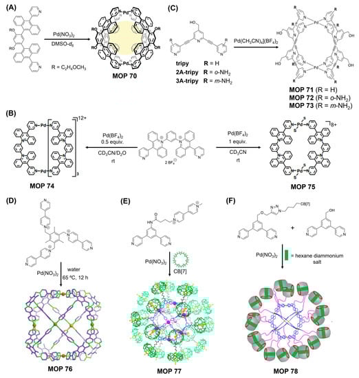 Second row transition metal ions (Pd, Cd, Ag, Rh, Ru) in combination with N-donor ligands have been extensively used to prepare MOPs that show good water solubility and stability to exhibit their potential usefulness for various applications. Early examples of MOPs documented the use of palladium metal ions. Fujita and coworkers have envisaged that square planar geometry of PdII metal complex would be suitable to combine with multitopic organic linkers to give rise diverse class of MOPs. Hydrophobic 4,4′-bipyridine linker self-assembles with [(en)Pd]2+ capping units (en = ethylenediamine) originating from [(en)Pd](NO3)2 salt to render (Figure 24A) water-soluble MOP 62 [(en)4Pd4(bpy)4]8+ in square geometry [60]. Hydrogen-bonding donating ability of the capping unit and the use of hydrophilic nitrate (NO3−) counter-anions make the MOP water-soluble. Guest encapsulation ability of the MOP was demonstrated by incorporating hydrophobic molecules such as 1,3,5-trimethoxybenzene within its interior. Later, Fujita group had reported that self-assembly of 1,3,5-tris(4-pyridyl)triazene and [(en)Pd](NO3)2 salt (in 6:4 ratio) produces the first ever water-soluble octahedron MOP 63, [Pd6L4]12+ [61]. Four triazine panels are held together by six palladium capping units (Figure 24B) through metal-ligand interactions to form truncated octahedron with alternate closed and open faces. Large interior cavity volume enables guest molecules to occupy the cavity useful for guest recognitions, chemical transformations and transportation [186]. Other variants of palladium(II) capping units including [(tmeda)Pd]2+ (tmeda = N,N,N′,N′-tetramethylethylenediamine) [187], chiral [(EtCyhex)Pd]2+ (EtCyhex = cis-(1R, 2R)-N,N′-diethyl-1,2-diaminocyclohexane) and [(bipy)Pd]2+ (bipy = 2,2′-bipyridine) with two accessible cis-oriented coordinated sites were also successfully used to make isostructural MOPs analogous to [Pd6L4]12+ octahedron.