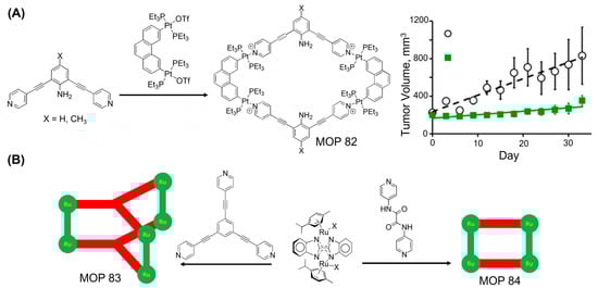 - Grishagin, I.V.; Pollock, J.B.; Kushal, S.; Cook, T.R.; Stang, P.J.; Olenyuk, B.Z. In vivo anticancer activity of rhomboidal Pt(II) metallacycles. Proc. Natl. Acad. Sci. USA 2014, 111, 18448–18453. [Google Scholar] [CrossRef]