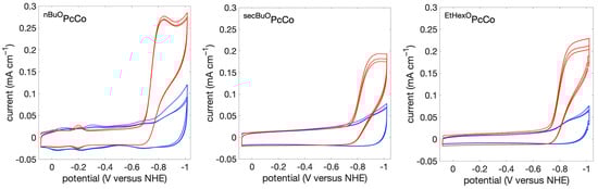 The solution electrochemistry of each catalyst was first explored in benzonitrile solvent (with 0.1 M nBu4NPF6 electrolyte) at 0.2 mM concentration under an Ar atmosphere. Two closely spaced, reversible waves are observed near −0.1 V versus Cp2Fe+/0 (Table 1). Voltammograms are set out in the Supporting Information, including wide (Figure S3) and narrow (Figures S4 and S5) scan ranges. Related voltammograms, in MeCN solvent, of nBuOPcCo also show some unassigned features [43]. The origin of the additional waves is not known, but differently solvent-ligated forms of the catalysts could be present [38]. Likewise, based on the above results, some degree of aggregation may occur in solution or at the electrode surface, resulting in the minor waves [31]. The largest observed waves occur at potentials consistent with the Co(III/II) couple [43]. A second reversible wave is observed between −0.9 and −1 V. The observed potentials are similar to those reported for nBuOPcCo in CH2Cl2 solvent [43].