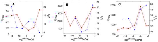 Comparisons of CO2 reduction rate constants from FOW analysis (left x-axes) and the ratios of observed currents and maximum catalytic currents (ip/i0, right y-axes) for nBuOPcCo (A), secBuOPcCo (B), and EtHexOPcCo (C).